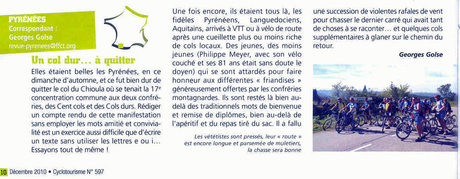 La 17ème Concentration Commune "Club des Cent Cols" - "Ordre des Cols Durs" s'est déroulée au Col du Chioula en Ariège. On se trouve sur une voie ancestrale, chemin parcouru par les troupeaux, les hommes paisibles ou en guerre; c’est en effet tout près de là que passaient dès le XIIès. les Cathares ou Bonshommes fuyant les croisades et l’inquisition pour se rendre en Catalogne.